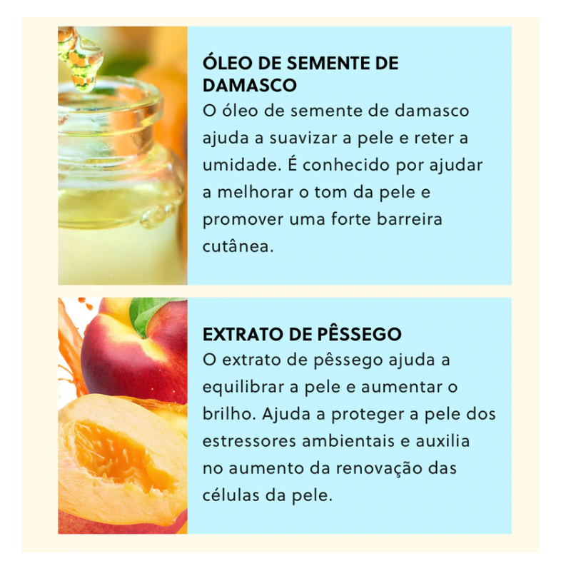 O extrato de pêssego ajuda a equilibrar a pele e aumentar o brilho. Ajuda a proteger a pele dos estressores ambientais e auxilia no aumento da renovação das células da pele.