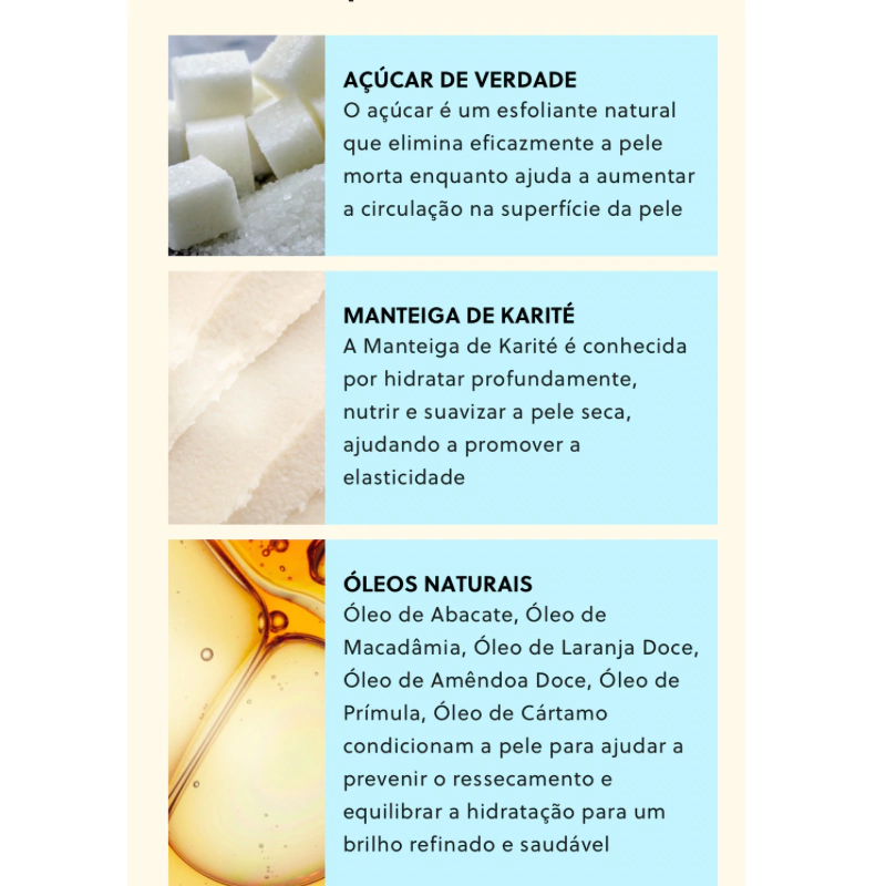 Feito com Açúcar, Manteiga de Karité, Extrato de Pêssego e uma variedade de óleos naturais como Semente de Damasco, Prímula, Abacate, Macadâmia, Amêndoa Doce, Cártamo e Óleos de Laranja para deixar a pele com uma sensação agradável e um cheiro delicioso.