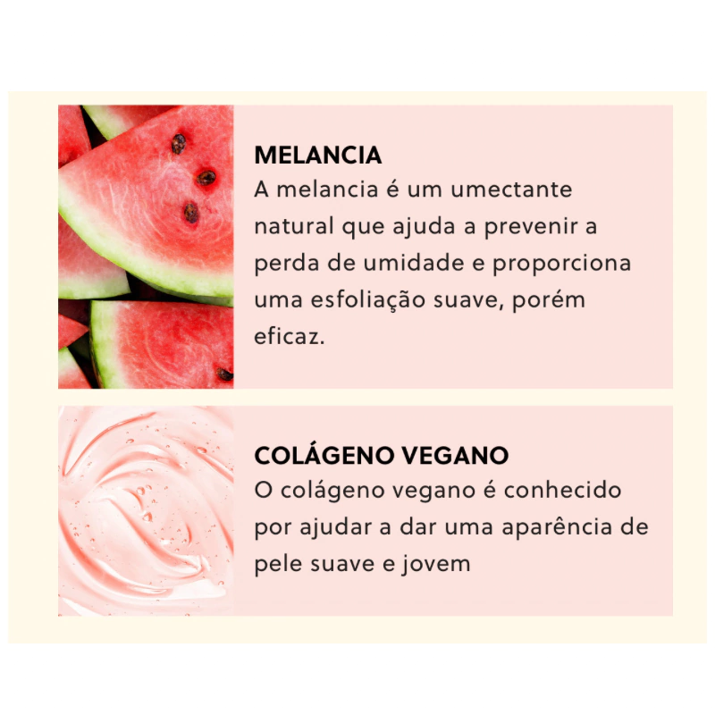 Aumente a sua rotina de banho, esfolia o dia e revele uma pele macia e brilhante com o aroma refrescante da melancia!