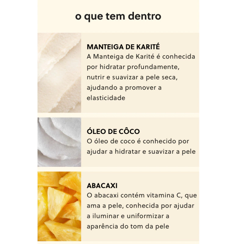 A Manteiga de Karité é conhecida por hidratar profundamente, nutrir e suavizar a pele seca, ajudando a promover a elasticidade