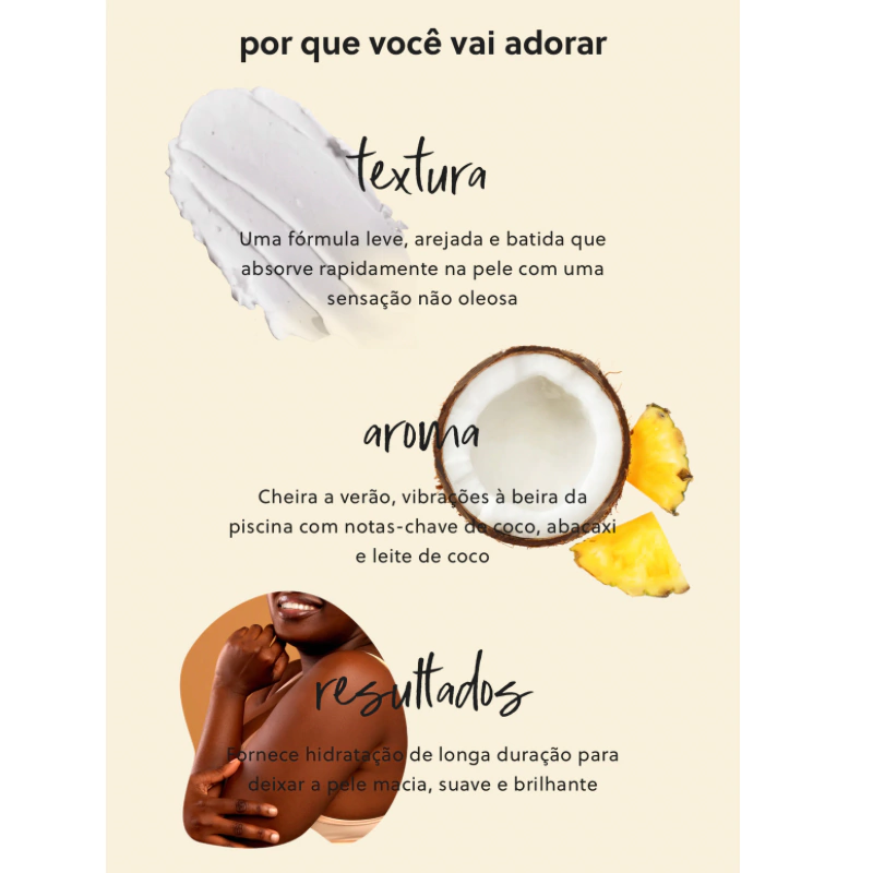 A hidratação da sua pele de volta à forma sem a sensação pesada das manteigas corporais tradicionais. Nossa fórmula leve e arejada desliza na pele sem economizar na hidratação.