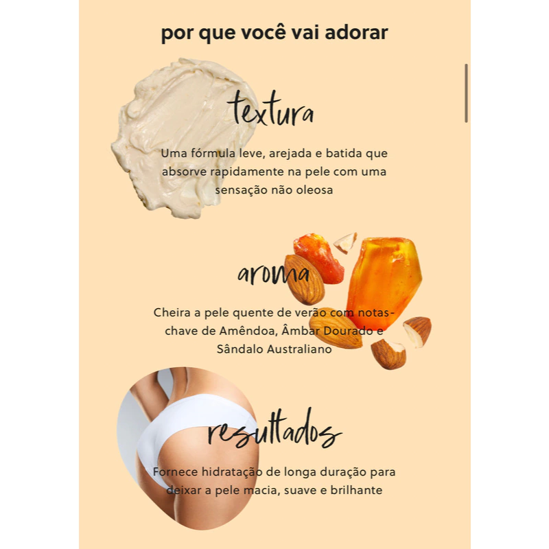 A hidratação da sua pele de volta à forma sem a sensação pesada das manteigas corporais tradicionais. Nossa fórmula leve e arejada desliza na pele sem economizar na hidratação.
