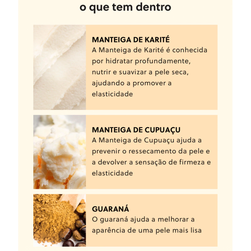 A Manteiga de Karité é conhecida por hidratar profundamente, nutrir e suavizar a pele seca, ajudando a promover a elasticidade