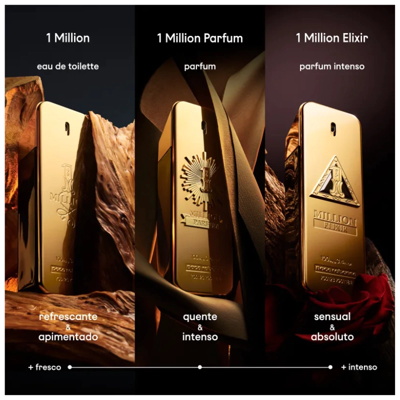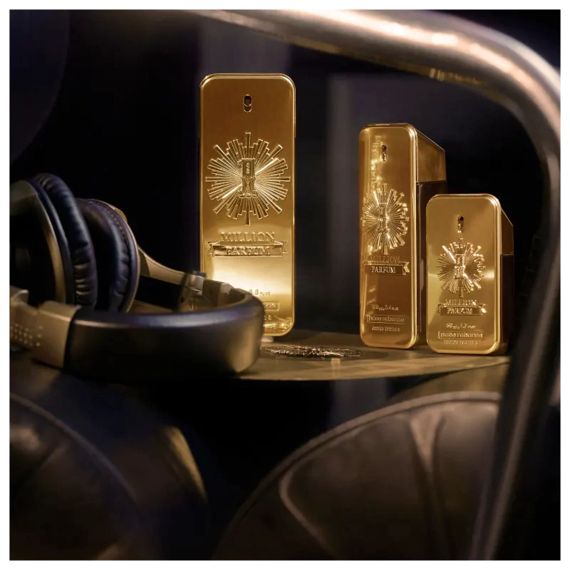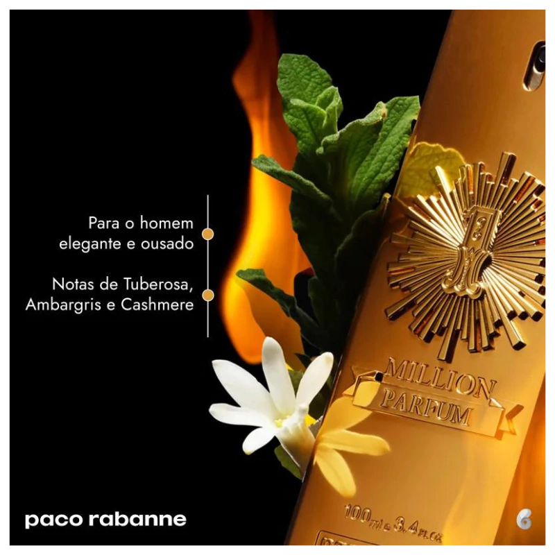 O Perfume Masculino 1 Million Parfum, de Paco Rabanne, traz acordes extravagantes de tuberosa, ambargris e cashmere, combinados com couro e ládano. O perfume One Million traz uma essência sofisticada, que destaca a opulência do couro com um toque salino, retido dentro do famoso frasco luxuoso em formato de uma barra de ouro.