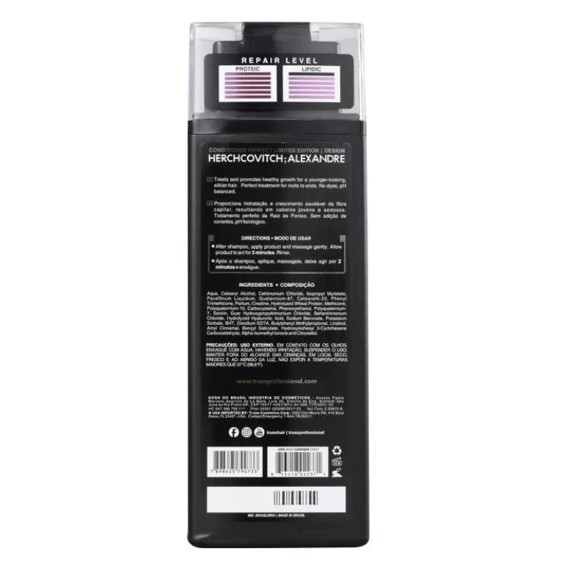 A fórmula de Truss Perfect devolve suavemente a elasticidade e resistência, além de evitar o frizz. Sua embalagem conta com estampas exclusivas criadas pelo estilista Alexandre Herchcovitch.